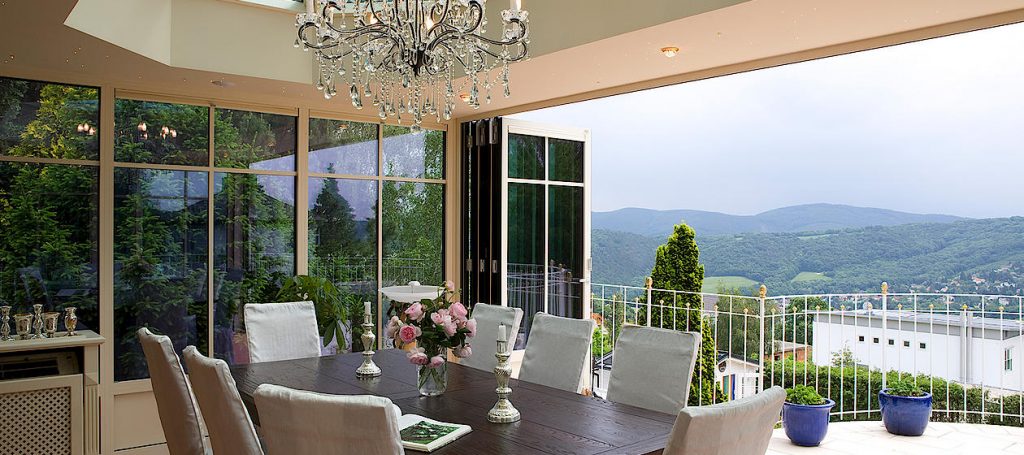 The present system makes it possible to quickly and fully open the glass facades and to arrange them in a space-saving manner at the opening edge. Folding of the leaves connected to each other is carried out either inward or outward. The large choice of variants of these folding and sliding partitions is a big advantage. The partitions are available with wooden or aluminum frames and with various glass thicknesses: there is a product suitable for every need.