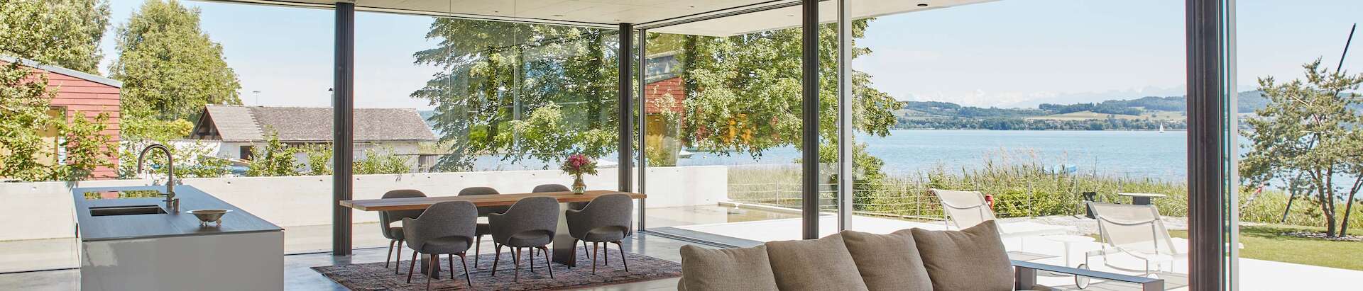 Standalone Fixed Panel A single large fixed glazed unit, typically the dominant element of a wall. The most visually clean configuration — no vertical divisions, no center rails, nothing between the viewer and the view except the perimeter frame. For views of particular quality or significance, the standalone fixed panel is the correct choice: any mullion or division that interrupts the view diminishes it.